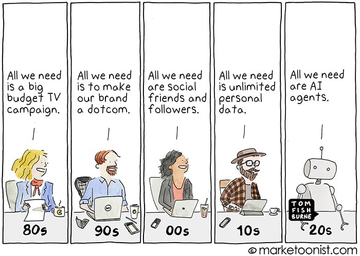 Marketoonist is the thought bubble of me, Tom Fishburne. I first started drawing cartoons as a student in the Harvard Business School newspaper (not quite as well-known for humor as the Lampoon) and later started this newsletter from a General Mills cubicle in 2002. The cartoons have followed my career ever since. I poke fun at the ever-changing world of marketing and business because I believe that laughing at ourselves can help us do our best work.